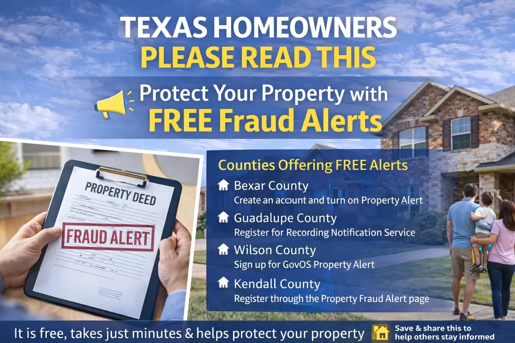 The good news is that several local counties around San Antonio offer a free Property Fraud Alert service that every homeowner should sign up for.